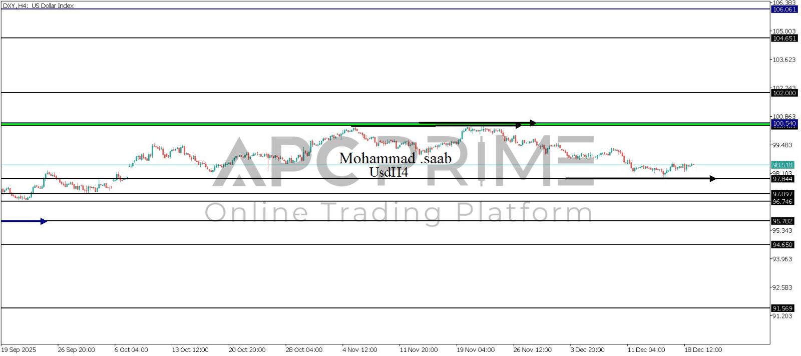 المنطقة الأهم (97.844) ثبات السعر أعلى المنطقة الأهم يتجه السعر إلى منطقة المقاومة (10.540-100.401) احتمالية الارتداد منها ممكنة ولكن باختراقها وإغلاق أعلى بشمعة أربع ساعات يتجه السعر إلى منطقة المقاومة (102.000)