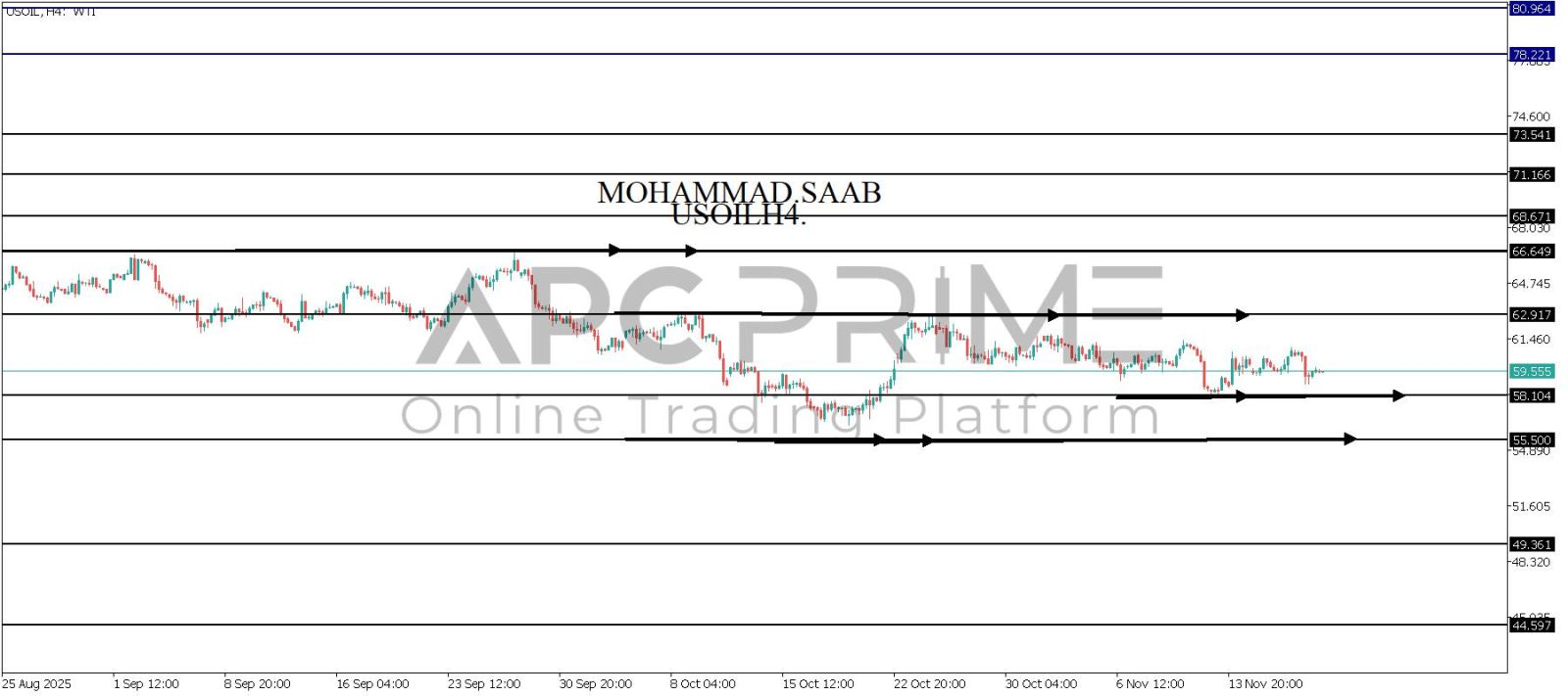 المنطقة الأهم (58.104) ثبات السعر أعلى المنطقة الأهم يتجه السعر إلى منطقة المقاومة (62.917) احتمالية الارتداد منها ممكنة ولكن باختراقها وإغلاق أعلى بشمعة أربع ساعات يتجه السعر إلى منطقة المقاومة (66.649)