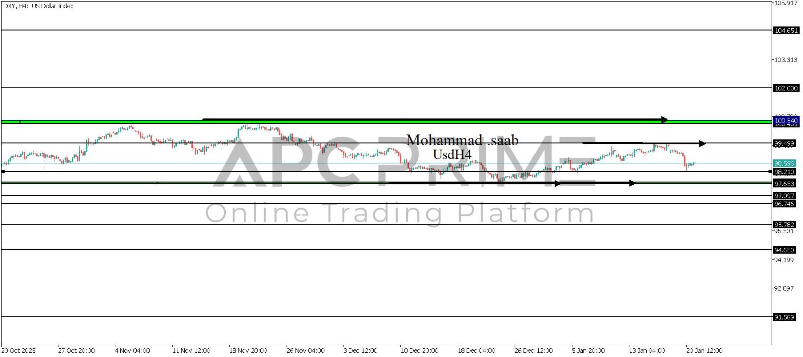 المنطقة الأهم (99.499) ثبات السعر أسفل المنطقة الأهم يتجه السعر إلى منطقة الدعم (98.210) احتمالية الارتداد منها ممكنة ولكن بكسرها وإغلاق أسفل بشمعة أربع ساعات يتجه السعر إلى منطقة الدعم (97.653-97.656)