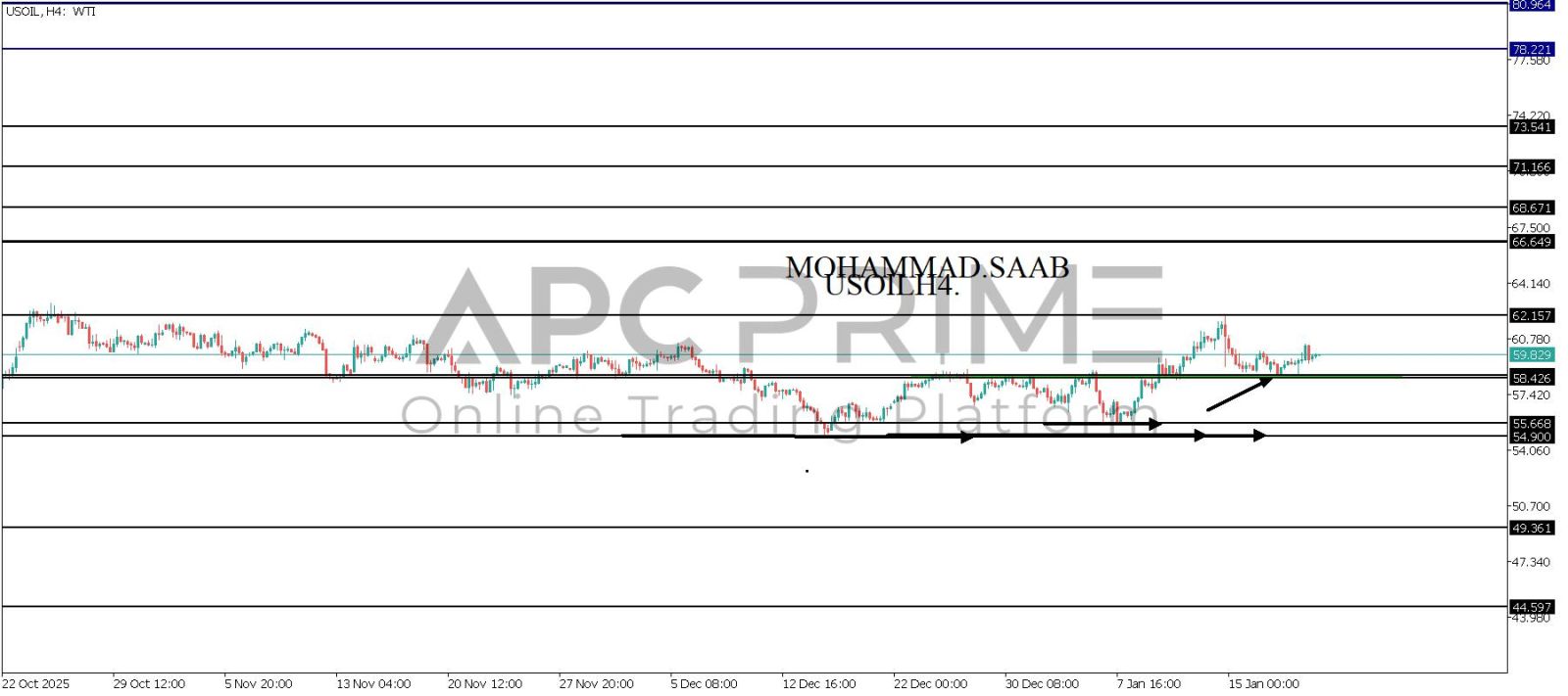 المنطقة الأهم (58.426-58.550) ثبات السعر أعلى المنطقة الأهم يتجه السعر إلى منطقة المقاومة (62.157) احتمالية الارتداد منها ممكنة ولكن باختراقها وإغلاق أعلى بشمعة أربع ساعات يتجه السعر إلى منطقة المقاومة (66.649)
