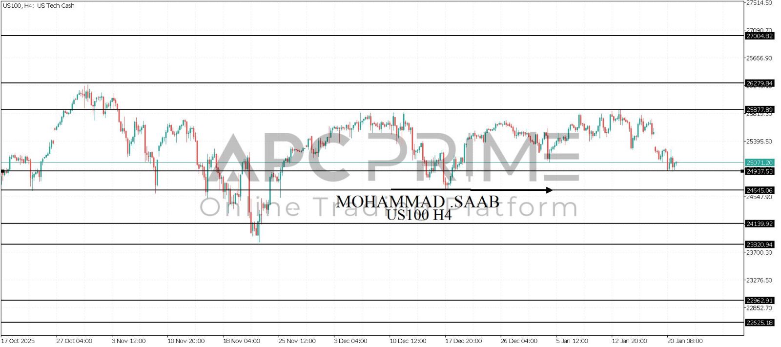 المنطقة الأهم (24937) ثبات السعر أعلى المنطقة الأهم يتجه السعر إلى منطقة المقاومة (25877) احتمالية الارتداد منها ممكنة ولكن باختراقها وإغلاق أعلى بشمعة أربع ساعات يتجه السعر إلى منطقة المقاومة (26279)