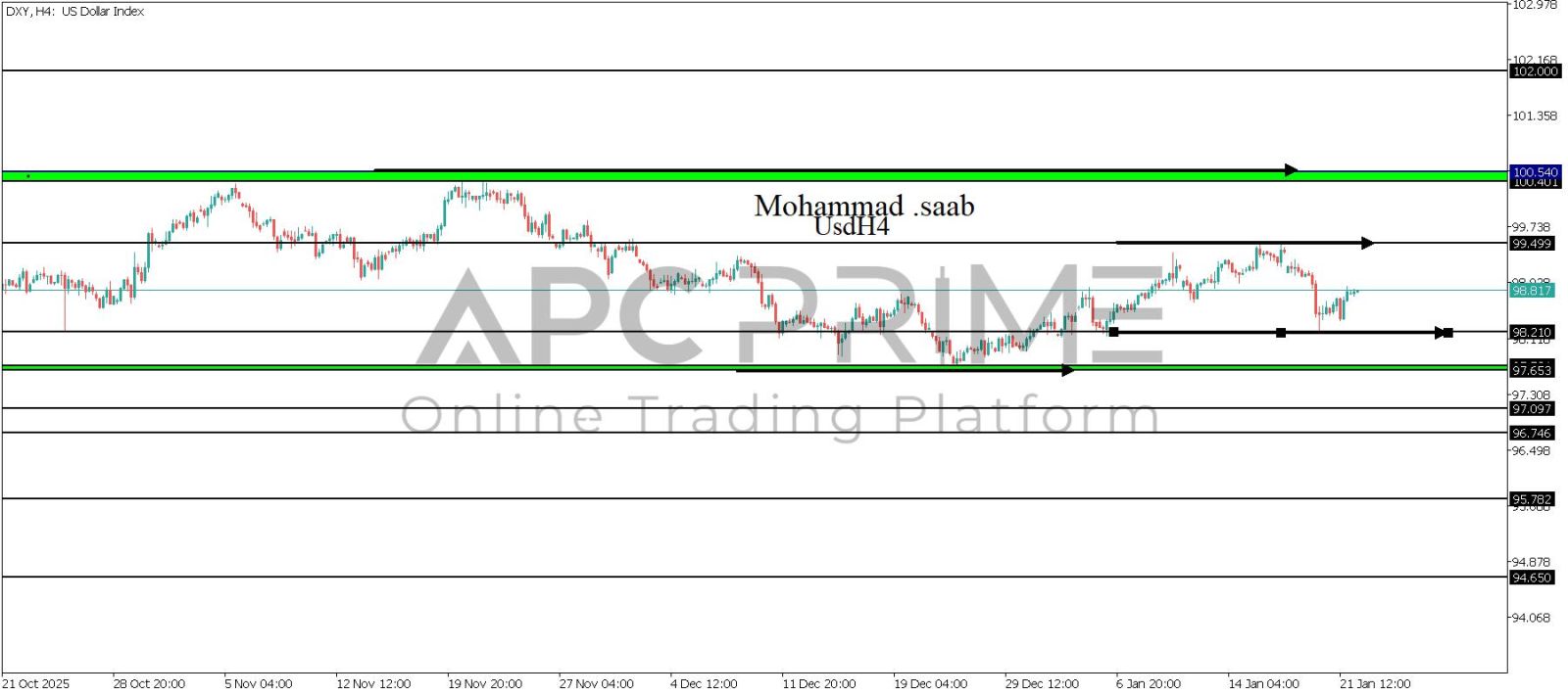 المنطقة الأهم (98.210) ثبات السعر أعلى المنطقة الأهم يتجه السعر إلى منطقة المقاومة (99.499) احتمالية الارتداد منها ممكنة ولكن باختراقها وإغلاق أعلى بشمعة أربع ساعات يتجه السعر إلى منطقة المقاومة (100.540-100.401)