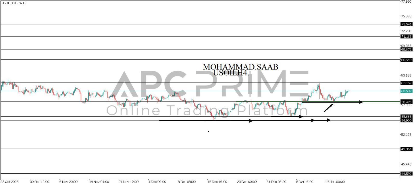 المنطقة الأهم (58.426-58.550) ثبات السعر أعلى المنطقة الأهم يتجه السعر إلى منطقة المقاومة (62.157) احتمالية الارتداد منها ممكنة ولكن باختراقها وإغلاق أعلى بشمعة أربع ساعات يتجه السعر إلى منطقة المقاومة (66.649)