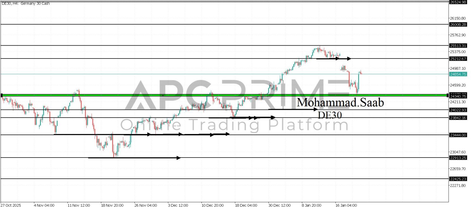 المنطقة الأهم (24340-24373) ثبات السعر أعلى المنطقة الأهم يتجه السعر إلى منطقة المقاومة (25212) احتمالية الارتداد منها ممكنة ولكن باختراقها وإغلاق أعلى بشمعة أربع ساعات يتجه السعر إلى منطقة المقاومة (25513)