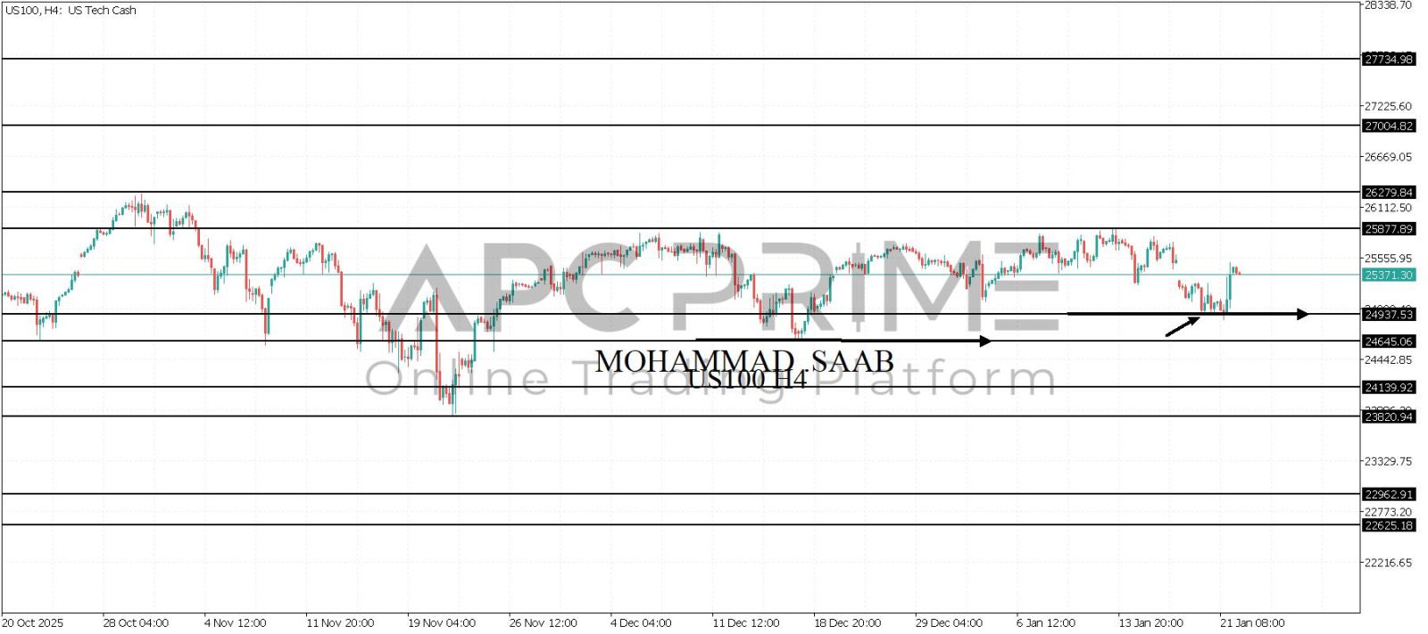 المنطقة الأهم (24937) ثبات السعر أعلى المنطقة الأهم يتجه السعر إلى منطقة المقاومة (25877) احتمالية الارتداد منها ممكنة ولكن باختراقها وإغلاق أعلى بشمعة أربع ساعات يتجه السعر إلى منطقة المقاومة (26279)