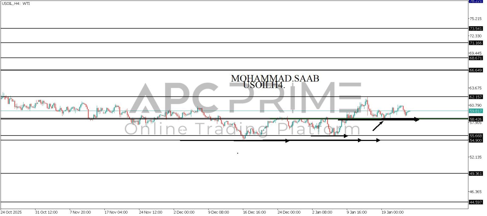 المنطقة الأهم (58.426-58.430) احتمالية الارتداد منها ممكنة ولكن بكسرها وإغلاق أسفل بشمعة أربع ساعات يتجه السعر إلى منطقة الدعم (55.668) احتمالية الارتداد منها ممكنة ولكن بكسرها وإغلاق أسفل بشمعة أربع ساعات يتجه السعر إلى منطقة الدعم (54.900)
