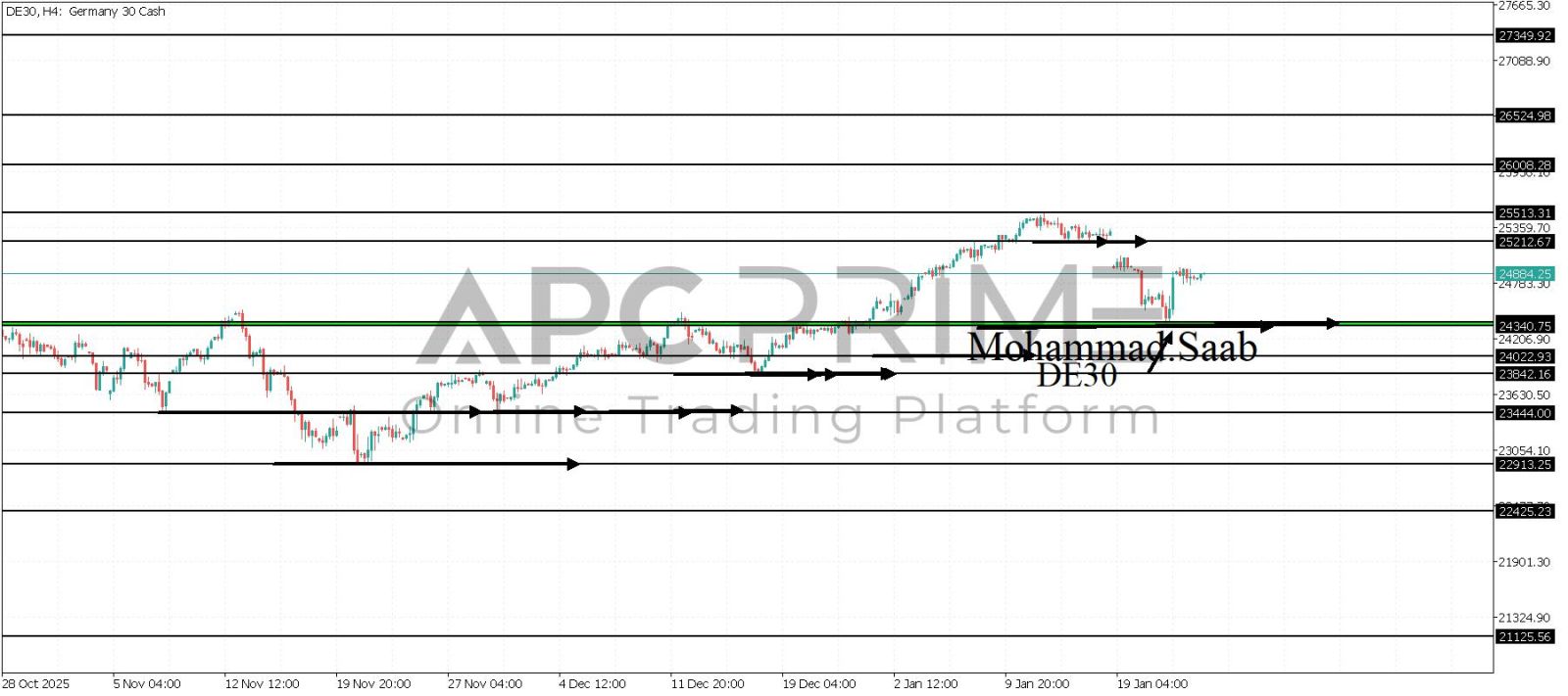 المنطقة الأهم (24340-24373) ثبات السعر أعلى المنطقة الأهم يتجه السعر إلى منطقة المقاومة (25212) احتمالية الارتداد منها ممكنة ولكن باختراقها وإغلاق أعلى بشمعة أربع ساعات يتجه السعر إلى منطقة المقاومة (25513)