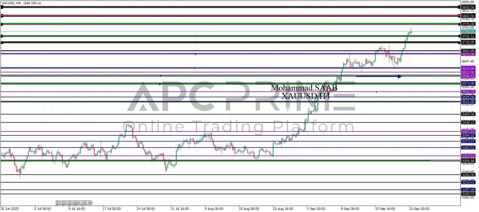 المنطقة الأهم (3732-3735) ثبات السعر أعلى المنطقة الأهم يتجه السعر إلى منطقة المقاومة (3776) احتمالية الارتداد منها ممكنة ولكن باختراقها وإغلاق أعلى بشمعة أربع ساعات يتجه السعر إلى منطقة المقاومة (3802)