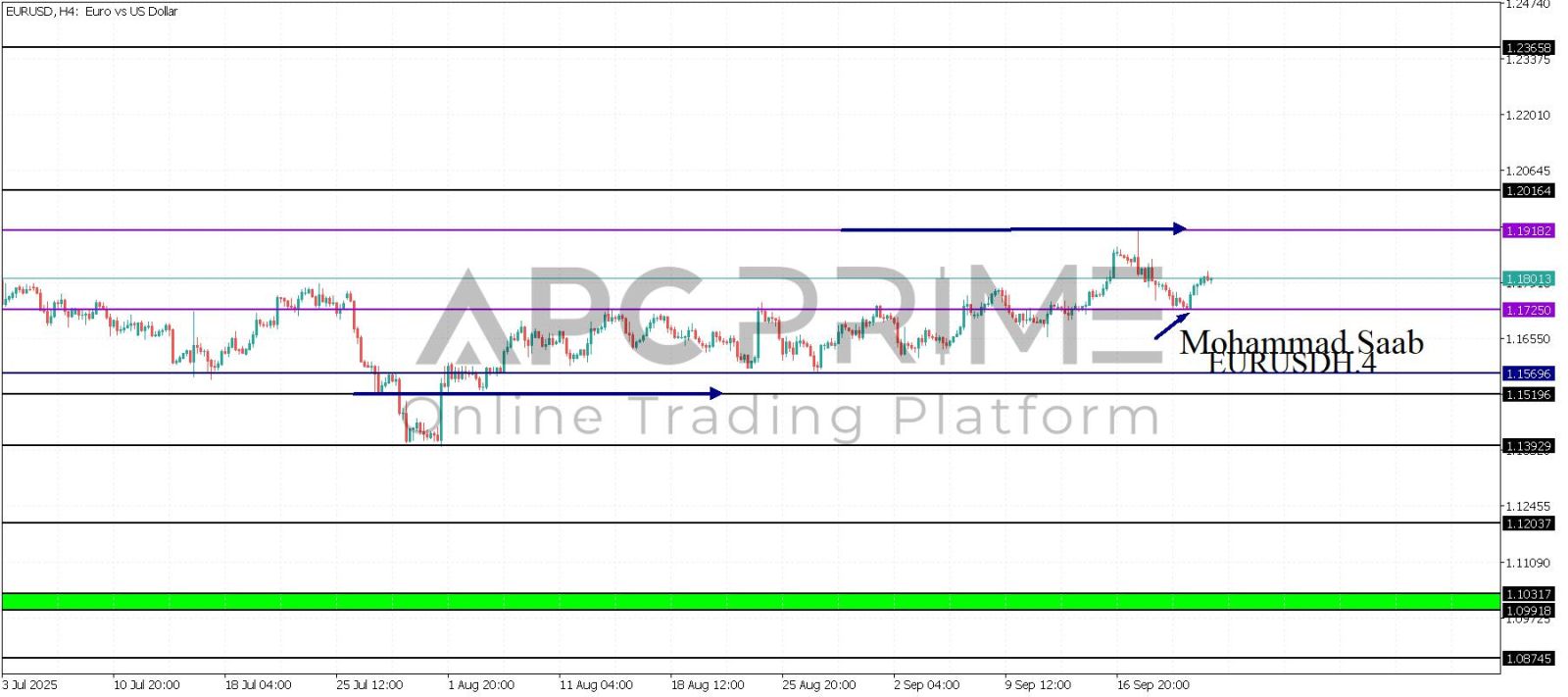 المنطقة الأهم (1.17261) ثبات السعر أعلى المنطقة الأهم يتجه السعر إلى منطقة المقاومة (1.19182) احتمالية الارتداد منها ممكنة ولكن باختراقها وإغلاق أعلى بشمعة أربع ساعات يتجه السعر إلى منطقة المقاومة (1.20164)