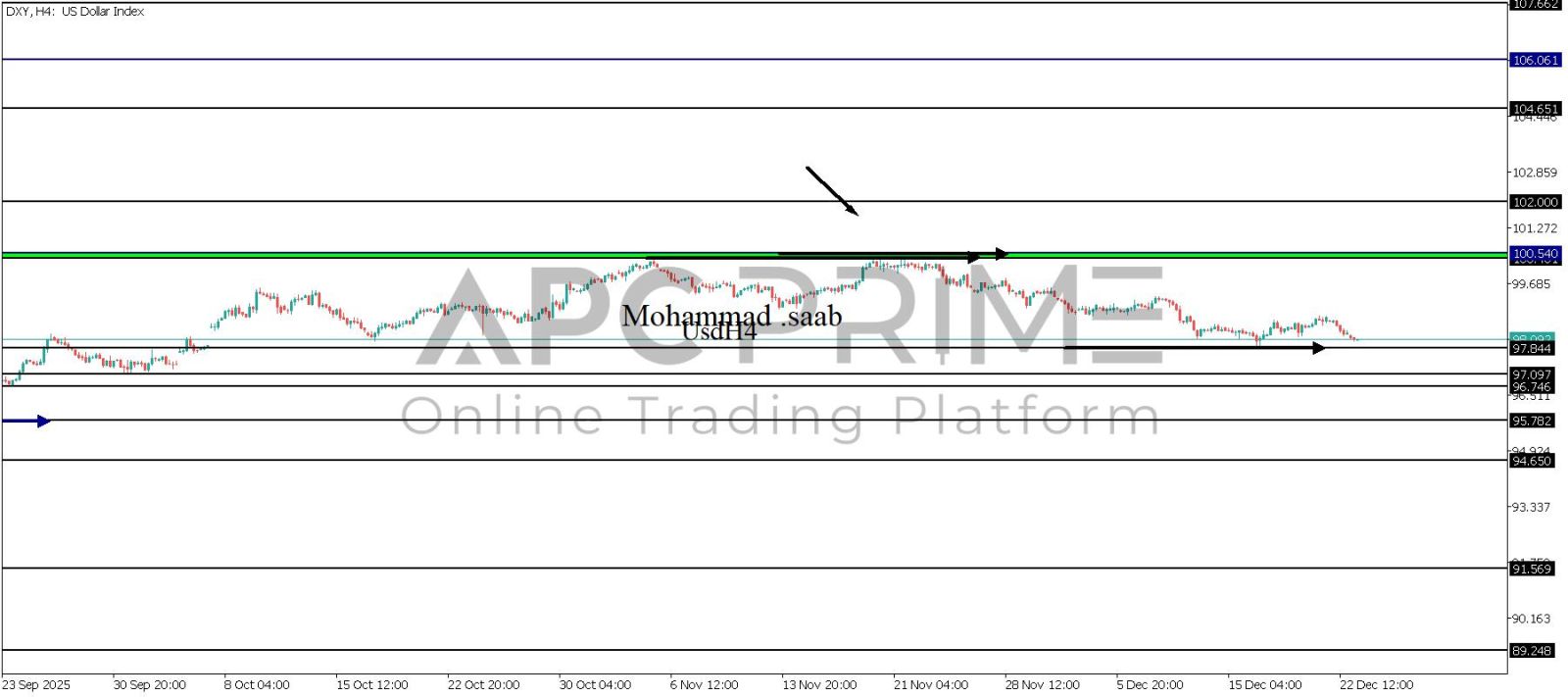المنطقة الأهم (100.540-100.401) ثبات السعر أسفل المنطقة الأهم يتجه السعر إلى منطقة الدعم (97.844) احتمالية الارتداد منها ممكنة ولكن بكسرها وإغلاق أسفل بشمعة أربع ساعات يتجه السعر إلى منطقة الدعم (97.097)