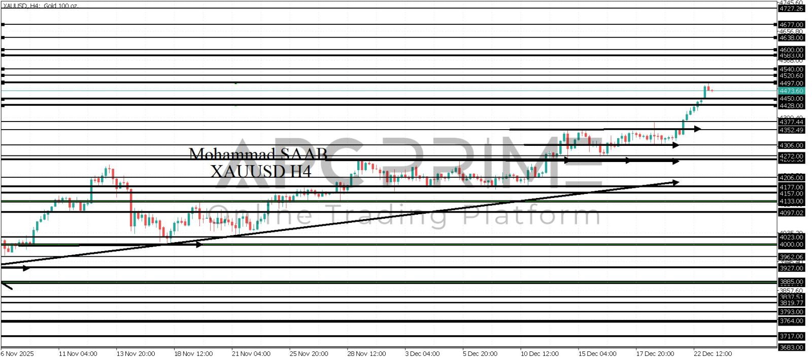 المنطقة الأهم (4497) احتمالية الارتداد منها ممكنة ولكن باختراقها وإغلاق أعلى بشمعة أربع ساعات يتجه السعر إلى منطقة المقاومة (4520) احتمالية الارتداد منها ممكنة ولكن باختراقها وإغلاق أعلى بشمعة أربع ساعات يتجه السعر إلى منطقة المقاومة (4540)