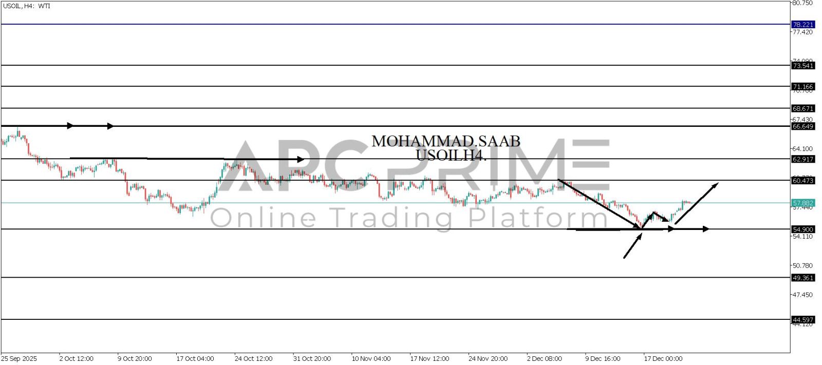 المنطقة الأهم (54.900) ثبات السعر أعلى المنطقة الأهم يتجه السعر إلى منطقة المقاومة (60.473) احتمالية الارتداد منها ممكنة ولكن باختراقها وإغلاق أعلى بشمعة أربع ساعات يتجه السعر إلى منطقة المقاومة (62.917)