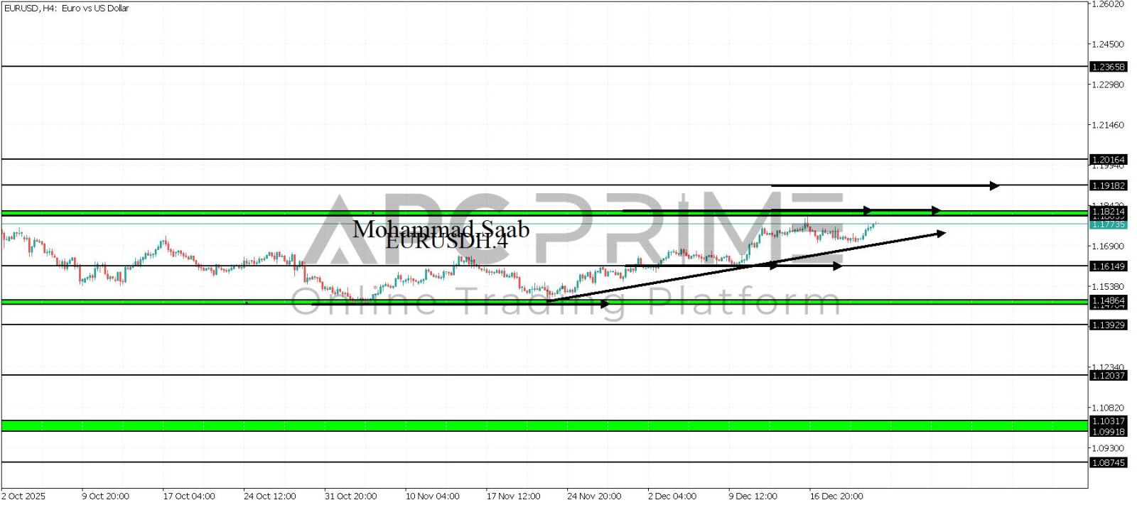 المنطقة الأهم (1.16149) ثبات السعر أعلى المنطقة الأهم يتجه السعر إلى منطقة المقاومة (1.18214-1.18039) احتمالية الارتداد منها ممكنة ولكن باختراقها وإغلاق أعلى بشمعة أربع ساعات يتجه السعر إلى منطقة المقاومة (1.19182)