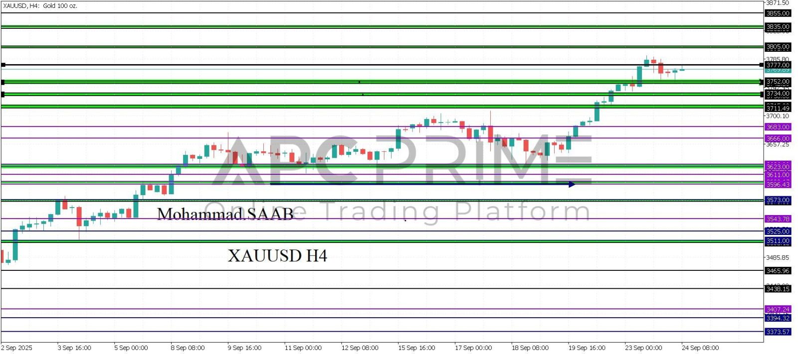 المنطقة الأهم (3752-3748) ثبات السعر أعلى المنطقة الأهم يتجه السعر إلى منطقة المقاومة (3777) احتمالية الارتداد منها ممكنة ولكن باختراقها وإغلاق أعلى بشمعة أربع ساعات يتجه السعر إلى منطقة المقاومة (3800-3805)