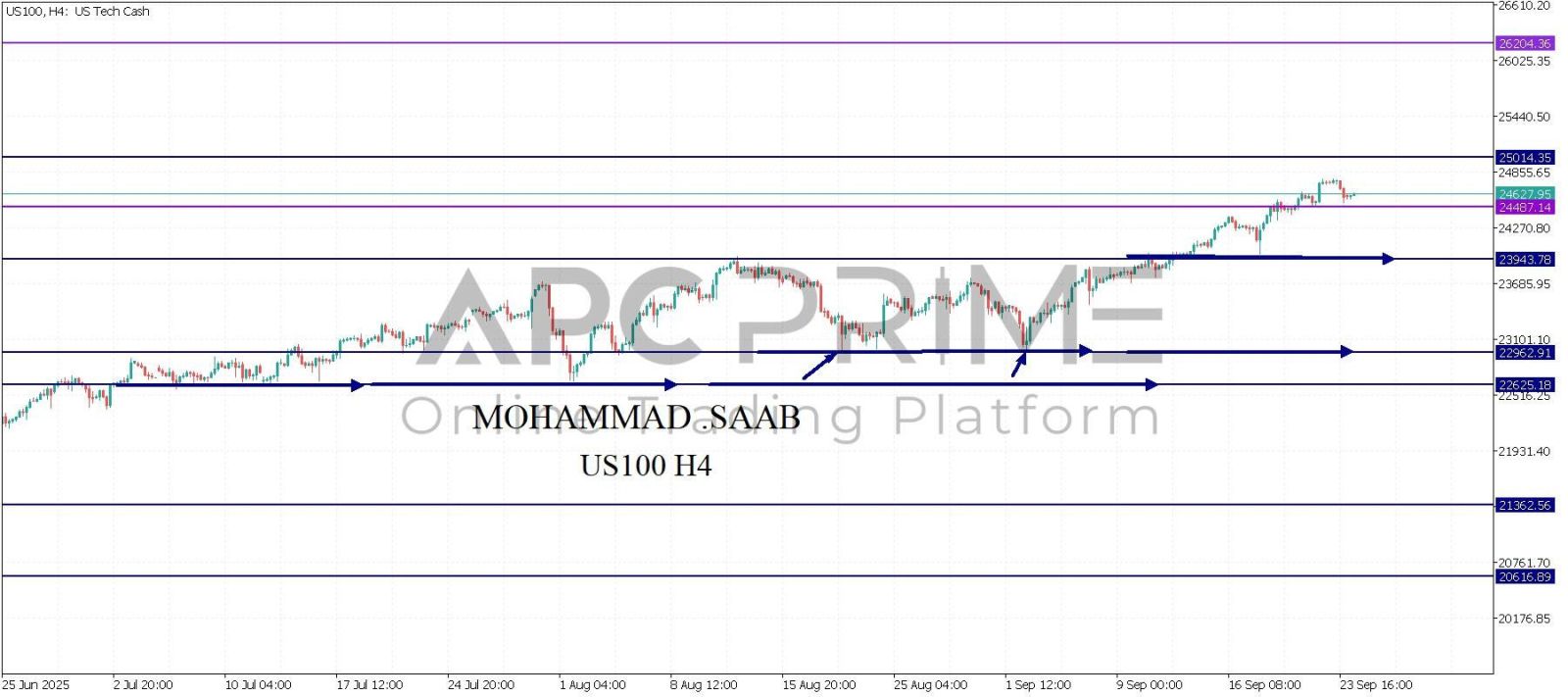 المنطقة الأهم (24487) ثبات السعر أعلى المنطقة الأهم يتجه السعر إلى منطقة المقاومة (25014) احتمالية الارتداد منها ممكنة ولكن باختراقها وإغلاق أعلى بشمعة أربع ساعات يتجه السعر إلى منطقة المقاومة (26204)