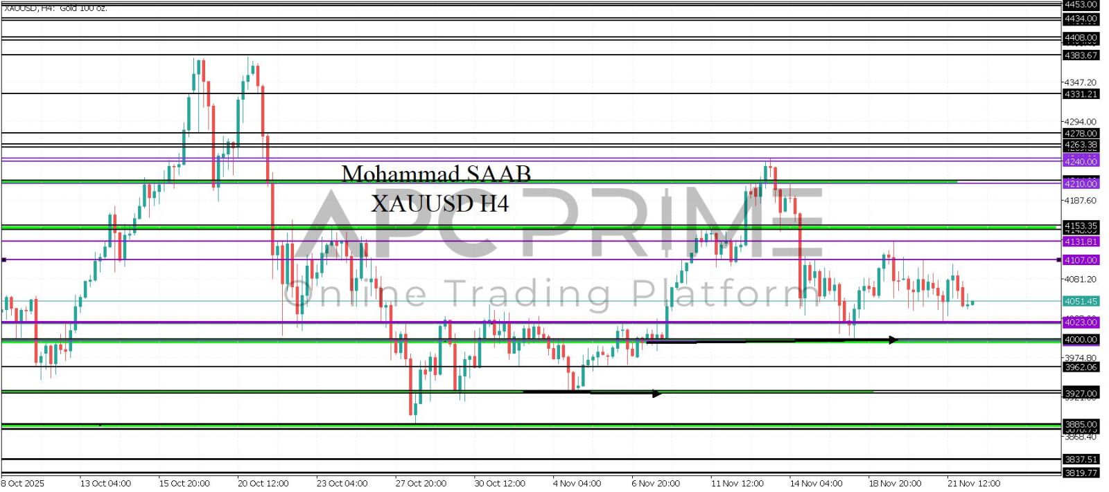 المنطقة الأهم (4023) ثبات السعر أعلى المنطقة الأهم يتجه السعر إلى منطقة المقاومة (4107-4131) احتمالية الارتداد منها ممكنة ولكن باختراقها وإغلاق أعلى بشمعة أربع ساعات يتجه السعر إلى منطقة المقاومة (4220-4210)