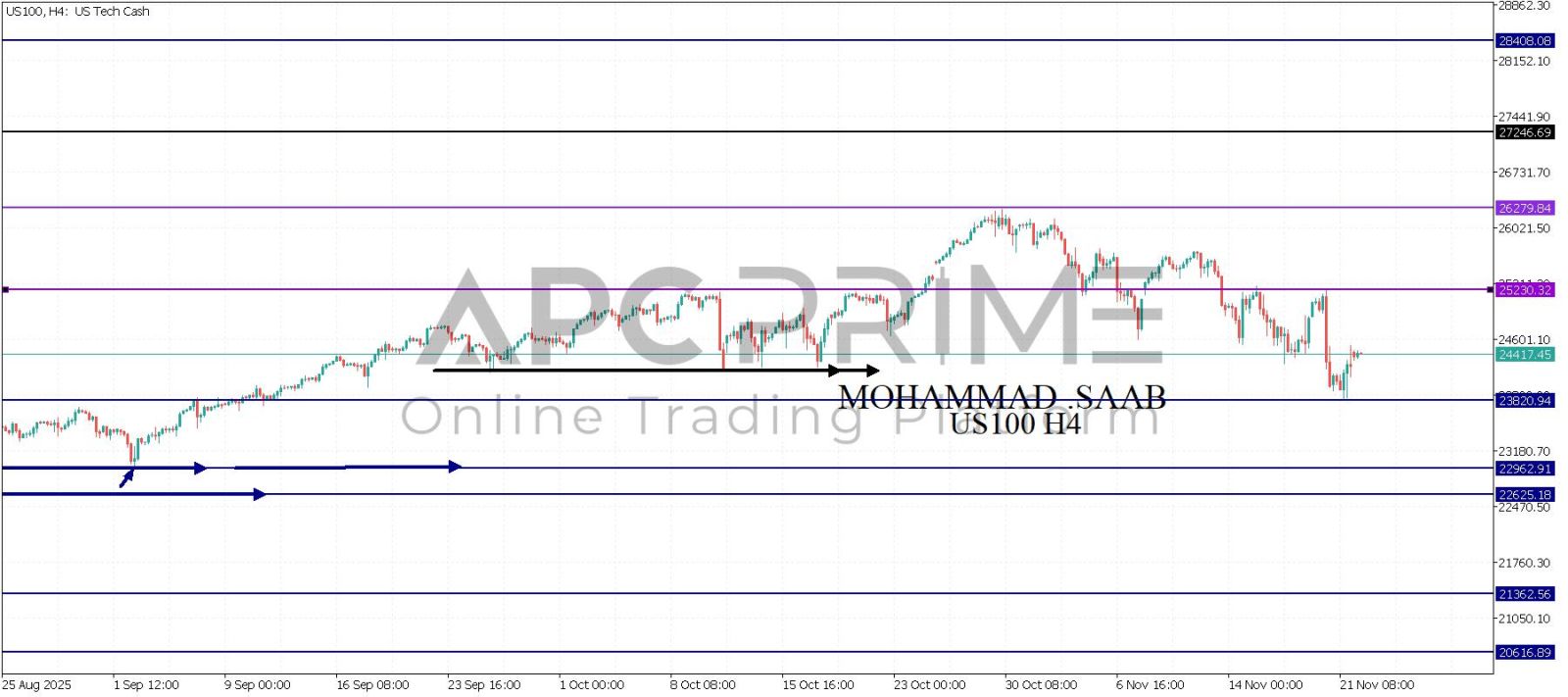 المنطقة الأهم (23820) ثبات السعر أعلى المنطقة الأهم يتجه السعر إلى منطقة المقاومة (25230) احتمالية الارتداد منها ممكنة ولكن باختراقها وإغلاق أعلى بشمعة أربع ساعات يتجه السعر إلى منطقة المقاومة (26279)