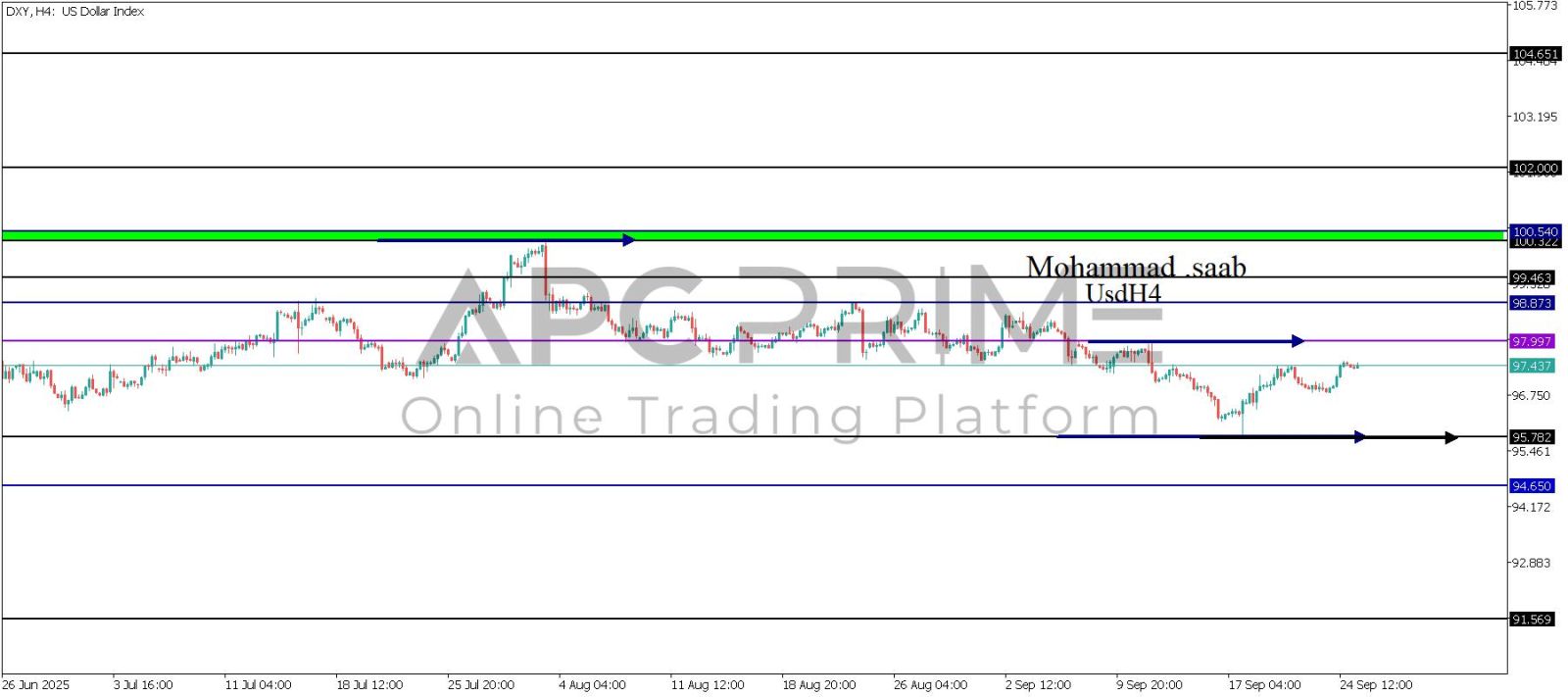 المنطقة الأهم (95.782) ثبات السعر أعلى المنطقة الأهم يتجه السعر إلى منطقة المقاومة (97.997) احتمالية الارتداد منها ممكنة ولكن باختراقها وإغلاق أعلى بشمعة أربع ساعات يتجه السعر إلى منطقة المقاومة (98.873)