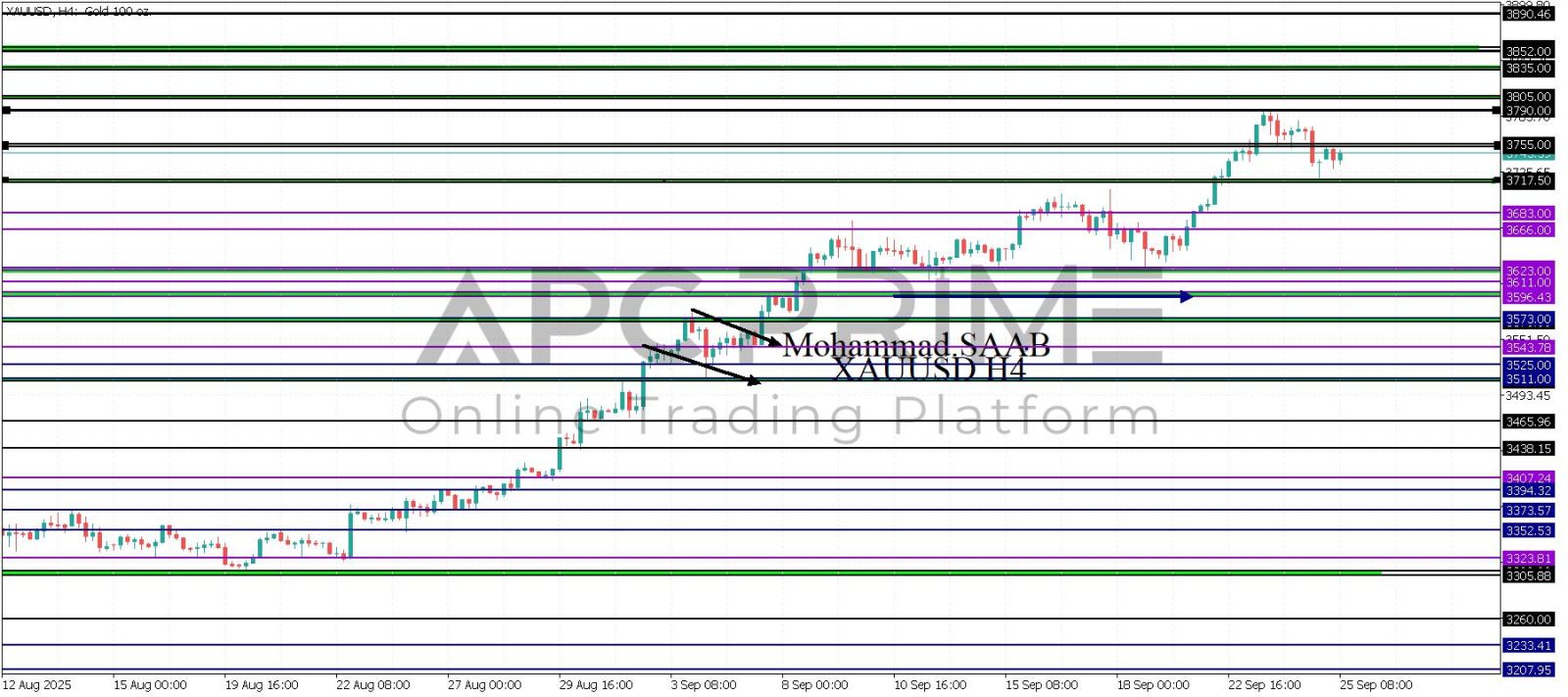 المنطقة الأهم (3717-3713) ثبات السعر أعلى المنطقة الأهم يتجه السعر إلى منطقة المقاومة (3755) احتمالية الارتداد منها ممكنة ولكن باختراقها وإغلاق أعلى بشمعة أربع ساعات يتجه السعر إلى منطقة المقاومة (3790)