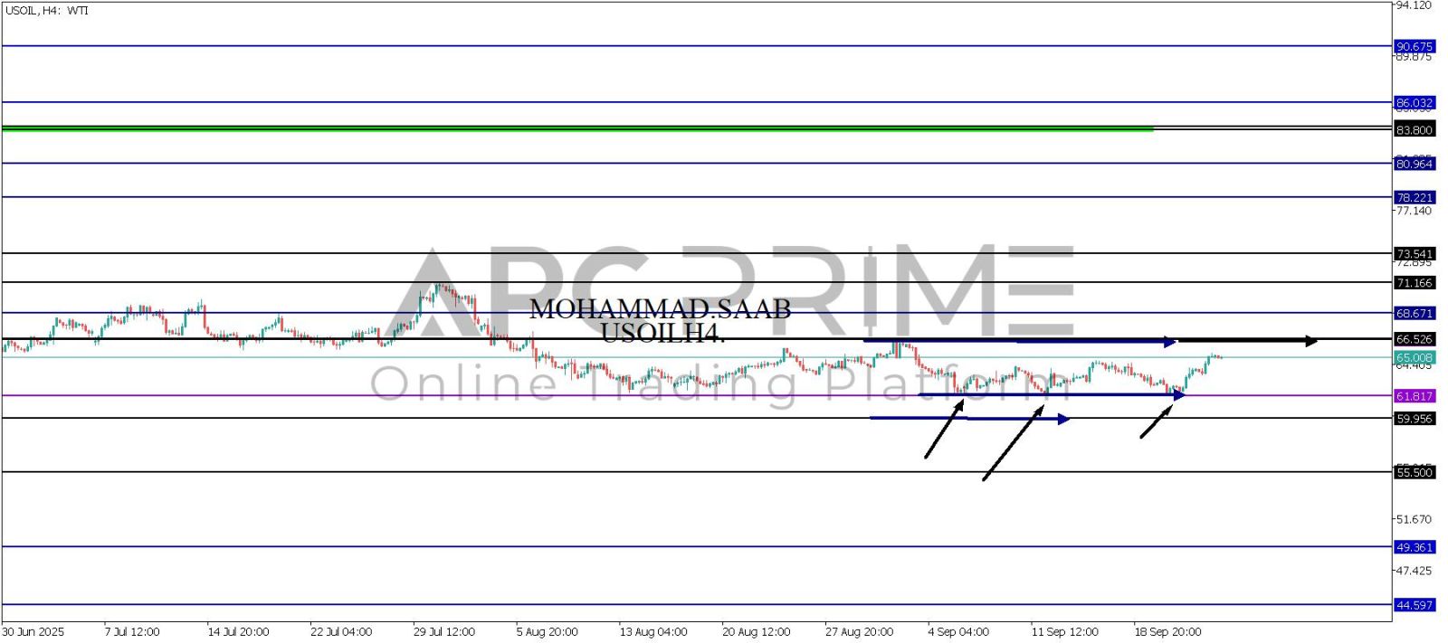 المنطقة الأهم (61.817) ثبات السعر أعلى المنطقة الأهم يتجه السعر إلى منطقة المقاومة (66.526) احتمالية الارتداد منها ممكنة ولكن باختراقها وإغلاق أعلى بشمعة أربع ساعات يتجه السعر إلى منطقة المقاومة (68.671)