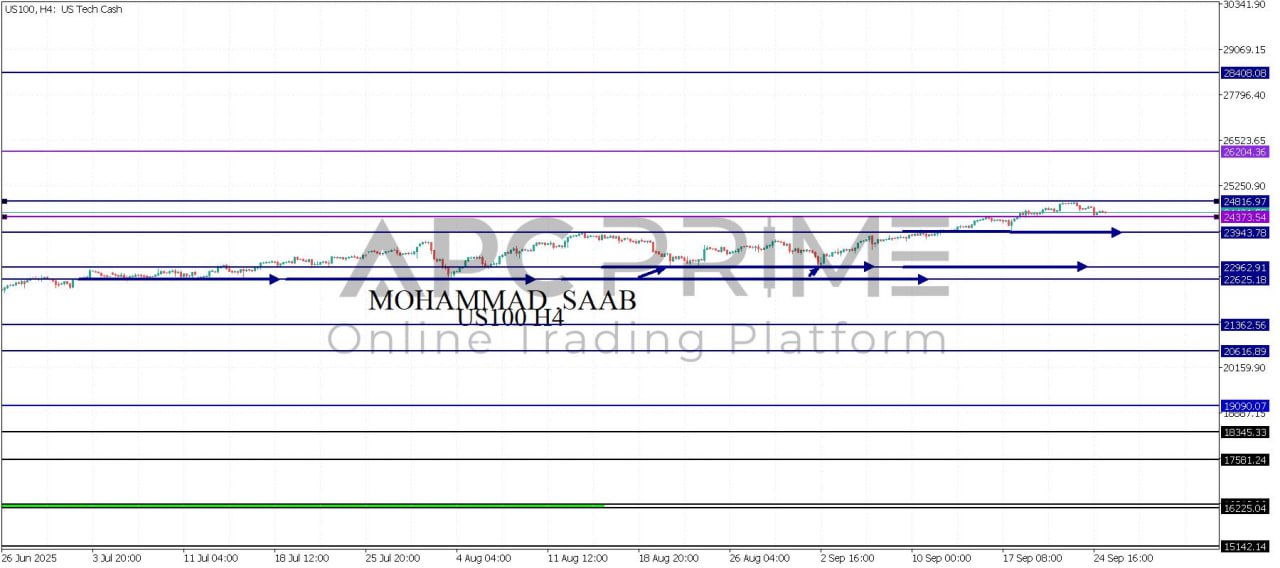 المنطقة الأهم (24816) ثبات السعر أسفل المنطقة الأهم يتجه السعر إلى منطقة الدعم (24374) احتمالية الارتداد منها ممكنة ولكن بكسرها وإغلاق أسفل بشمعة أربع ساعات يتجه السعر إلى منطقة الدعم (23943)
