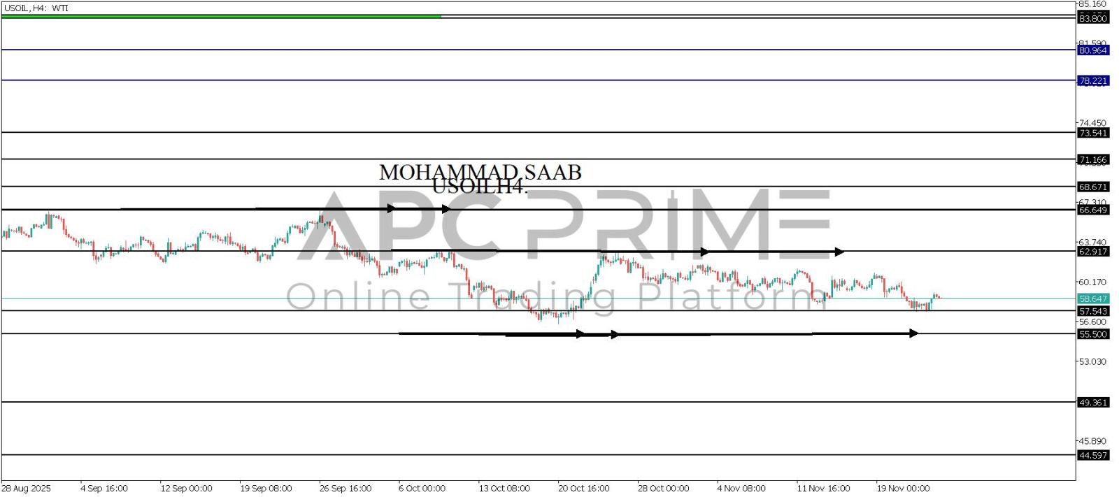 المنطقة الأهم (57.543) ثبات السعر أعلى المنطقة الأهم يتجه السعر إلى منطقة المقاومة (62.917) احتمالية الارتداد منها ممكنة ولكن باختراقها وإغلاق أعلى بشمعة أربع ساعات يتجه السعر إلى منطقة المقاومة (66.649)