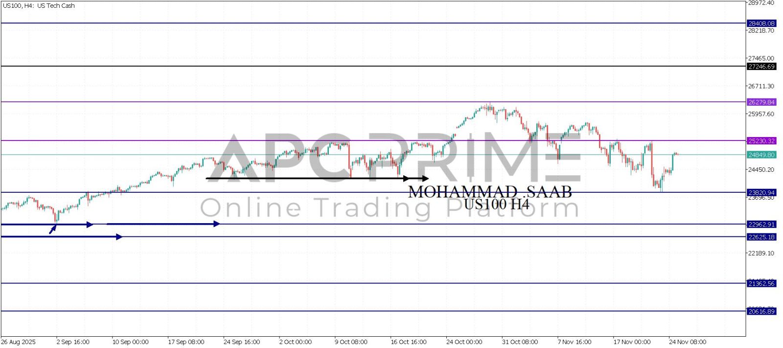المنطقة الأهم (23820) ثبات السعر أعلى المنطقة الأهم يتجه السعر إلى منطقة المقاومة (25230) احتمالية الارتداد منها ممكنة ولكن باختراقها وإغلاق أعلى بشمعة أربع ساعات يتجه السعر إلى منطقة المقاومة (26279)