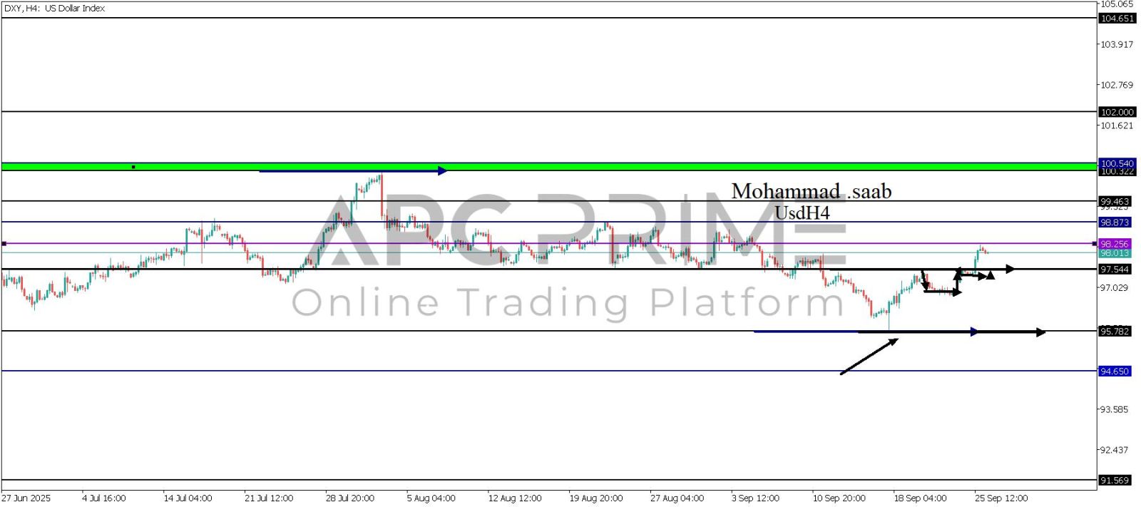 المنطقة الأهم (97.544) ثبات السعر أعلى المنطقة الأهم يتجه السعر إلى منطقة المقاومة (98.256) احتمالية الارتداد منها ممكنة ولكن باختراقها وإغلاق أعلى بشمعة أربع ساعات يتجه السعر إلى منطقة المقاومة (98.873)