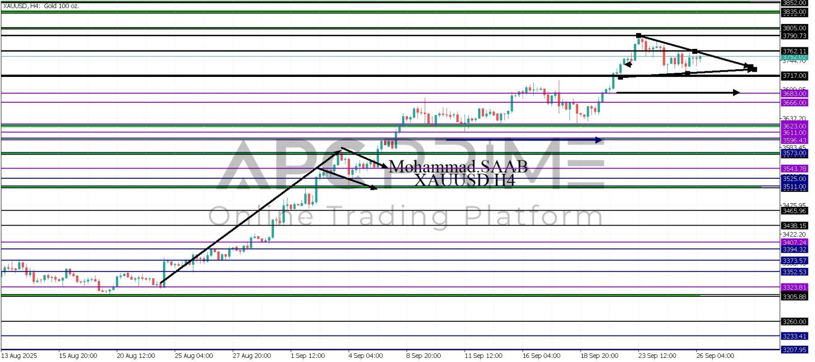 المنطقة الأهم (3717-3713) ثبات السعر أعلى المنطقة الأهم يتجه السعر إلى منطقة المقاومة (3762) احتمالية الارتداد منها ممكنة ولكن باختراقها وإغلاق أعلى بشمعة أربع ساعات يتجه السعر إلى منطقة المقاومة (3790)