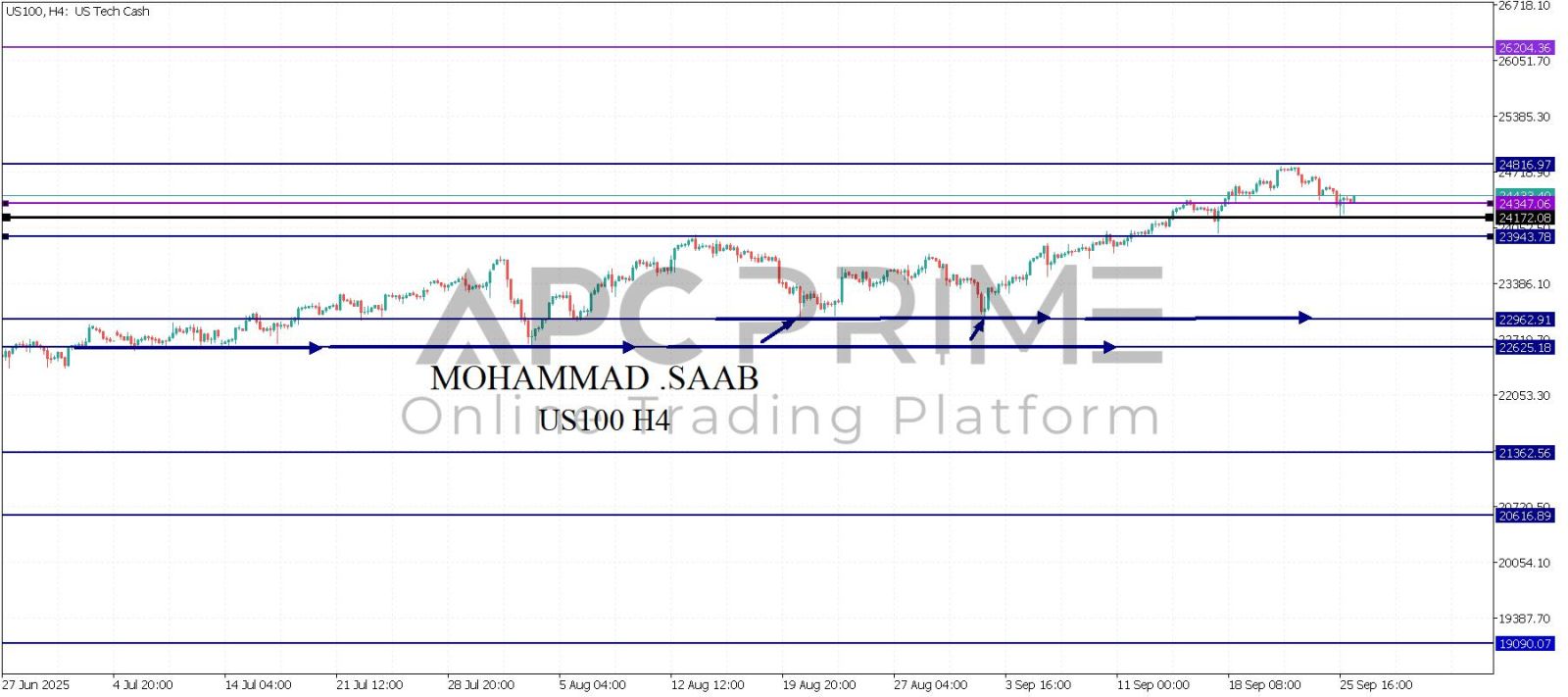 المنطقة الأهم (24347) ثبات السعر أعلى المنطقة الأهم يتجه السعر إلى منطقة المقاومة (24816) احتمالية الارتداد منها ممكنة ولكن باختراقها وإغلاق أعلى بشمعة أربع ساعات يتجه السعر إلى منطقة المقاومة (26204)