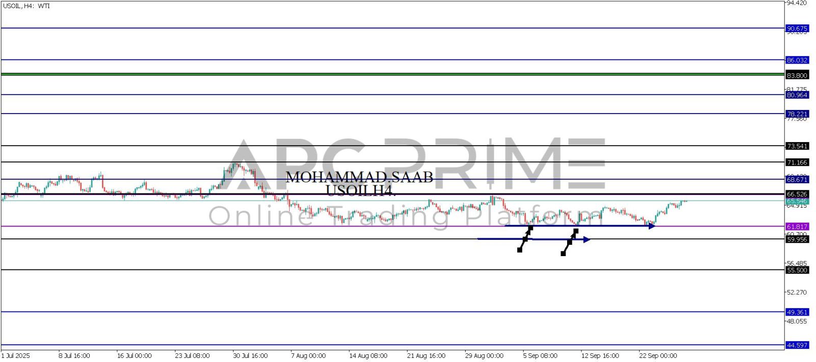 المنطقة الأهم (61.817) ثبات السعر أعلى المنطقة الأهم يتجه السعر إلى منطقة المقاومة (66.526) احتمالية الارتداد منها ممكنة ولكن باختراقها وإغلاق أعلى بشمعة أربع ساعات يتجه السعر إلى منطقة المقاومة (68.671)