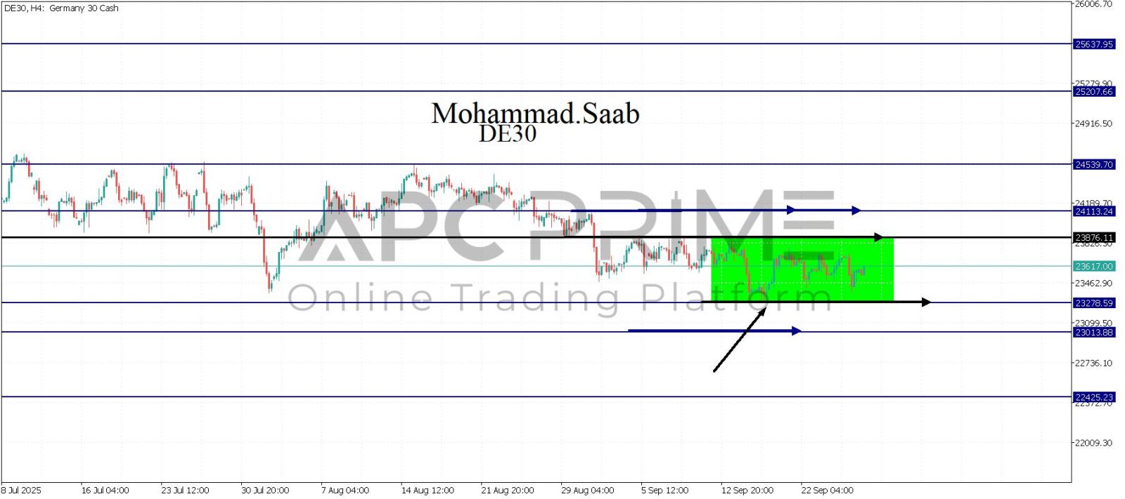 المنطقة الأهم (23278) ثبات السعر أعلى المنطقة الأهم يتجه السعر إلى منطقة المقاومة (23876) احتمالية الارتداد منها ممكنة ولكن باختراقها وإغلاق أعلى بشمعة أربع ساعات يتجه السعر إلى منطقة المقاومة (24113)