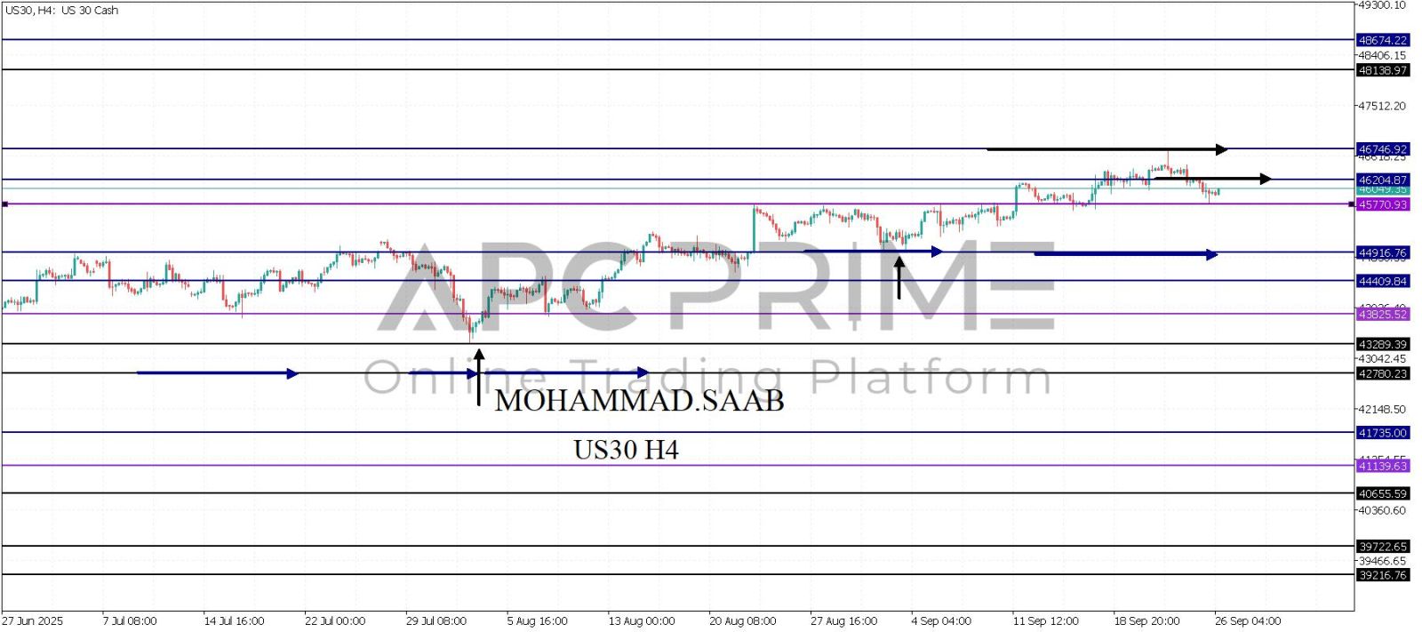 المنطقة الأهم (45770) ثبات السعر أعلى المنطقة الأهم يتجه السعر إلى منطقة المقاومة (46204) احتمالية الارتداد منها ممكنة ولكن باختراقها وإغلاق أعلى بشمعة أربع ساعات يتجه السعر إلى منطقة المقاومة (46746)