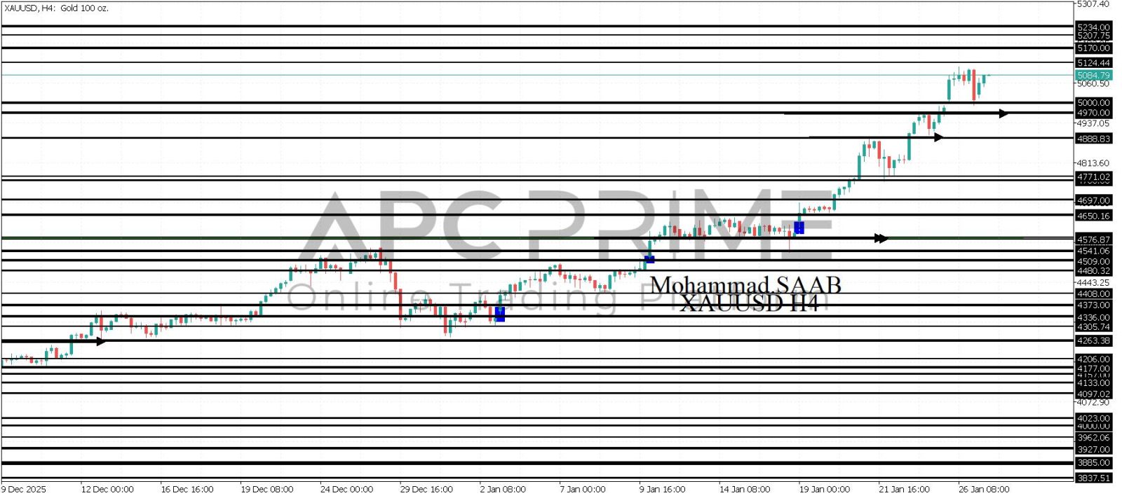 المنطقة الأهم (5000) ثبات السعر أعلى المنطقة الأهم يتجه السعر إلى منطقة المقاومة (5124) احتمالية الارتداد منها ممكنة ولكن باختراقها وإغلاق أعلى بشمعة أربع ساعات يتجه السعر إلى منطقة المقاومة (5170)