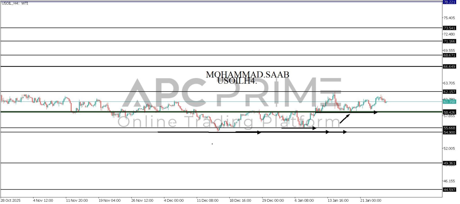 المنطقة الأهم (58.426-58.420) احتمالية الارتداد منها ممكنة ولكن بكسرها وإغلاق أسفل بشمعة أربع ساعات يتجه السعر إلى منطقة الدعم (55.668) احتمالية الارتداد منها ممكنة ولكن بكسرها وإغلاق أسفل بشمعة أربع ساعات يتجه السعر إلى منطقة الدعم (54.900)