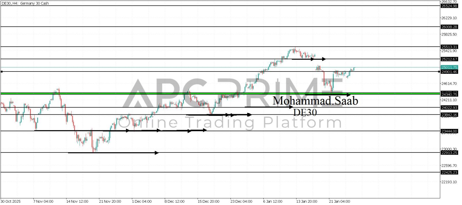 المنطقة الأهم (24901) ثبات السعر أعلى المنطقة الأهم يتجه السعر إلى منطقة المقاومة (25212) احتمالية الارتداد منها ممكنة ولكن باختراقها وإغلاق أعلى بشمعة أربع ساعات يتجه السعر إلى منطقة المقاومة (25513)