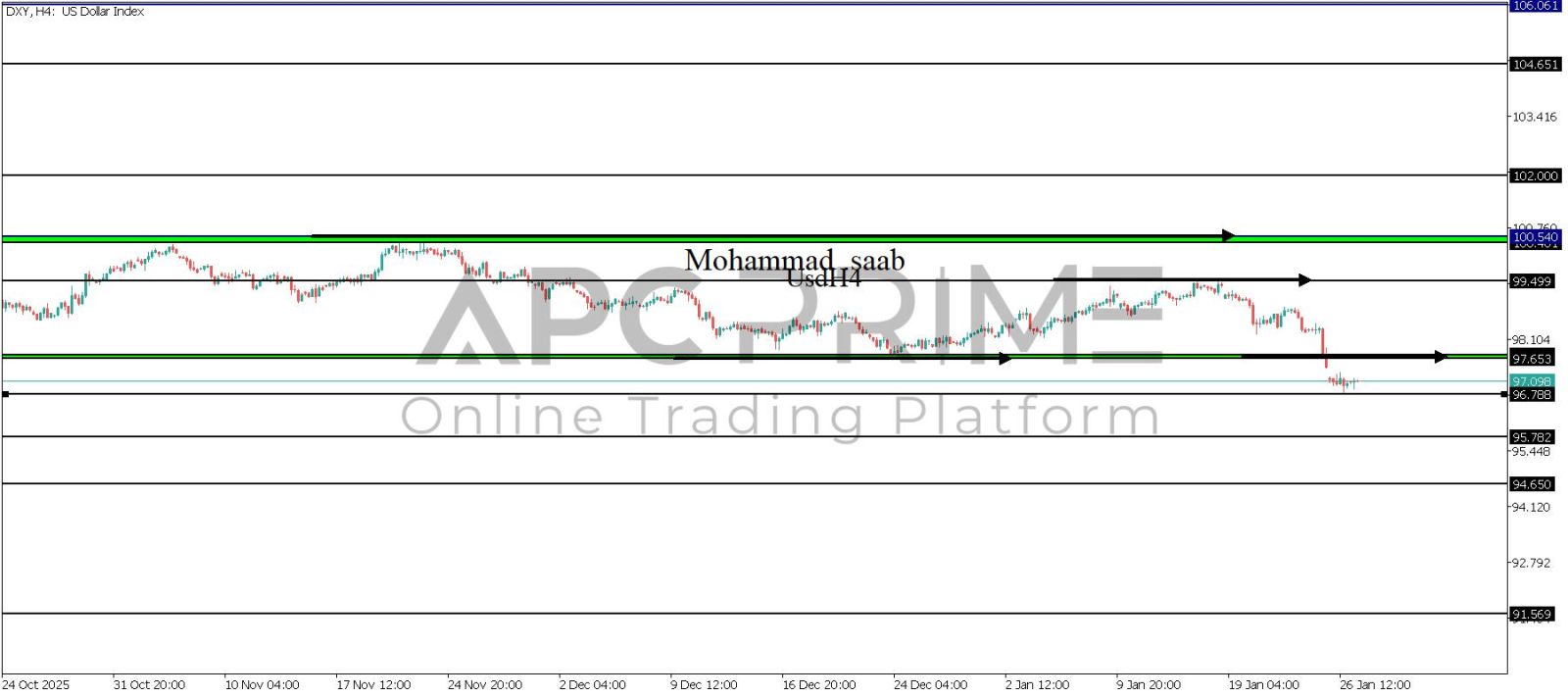 المنطقة الأهم (97.650-97.653) احتمالية الارتداد منها ممكنة ولكن باختراقها وإغلاق أعلى بشمعة أربع ساعات يتجه السعر إلى منطقة المقاومة (100.401-100.540) احتمالية الارتداد منها ممكنة ولكن باختراقها وإغلاق أعلى بشمعة أربع ساعات يتجه السعر إلى منطقة المقاومة (102.000)