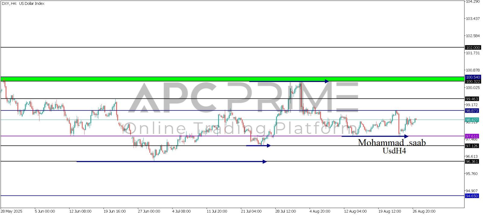 المنطقة الأهم (97.611) احتمالية الارتداد منها ممكنة ولكن بكسرها وإغلاق أسفل بشمعة أربع ساعات يتجه السعر إلى منطقة الدعم (97.126) احتمالية الارتداد منها ممكنة ولكن بكسرها وإغلاق أسفل بشمعة أربع ساعات يتجه السعر إلى منطقة الدعم (96.361)