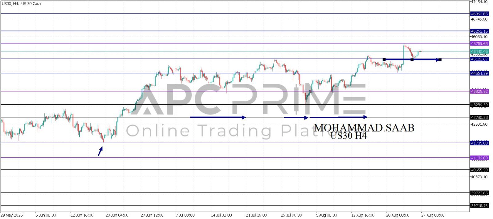 المنطقة الأهم (45128) ثبات السعر أعلى المنطقة الأهم يتجه السعر إلى منطقة المقاومة (45759) احتمالية الارتداد منها ممكنة ولكن باختراقها وإغلاق أعلى بشمعة أربع ساعات يتجه السعر إلى منطقة المقاومة (46262)