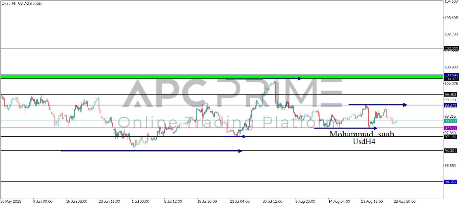 المنطقة الأهم (98.873) ثبات السعر أسفل المنطقة الأهم يتجه السعر إلى منطقة الدعم (97.611) احتمالية الارتداد منها ممكنة ولكن بكسرها وإغلاق أسفل بشمعة أربع ساعات يتجه السعر إلى منطقة الدعم (97.126)
