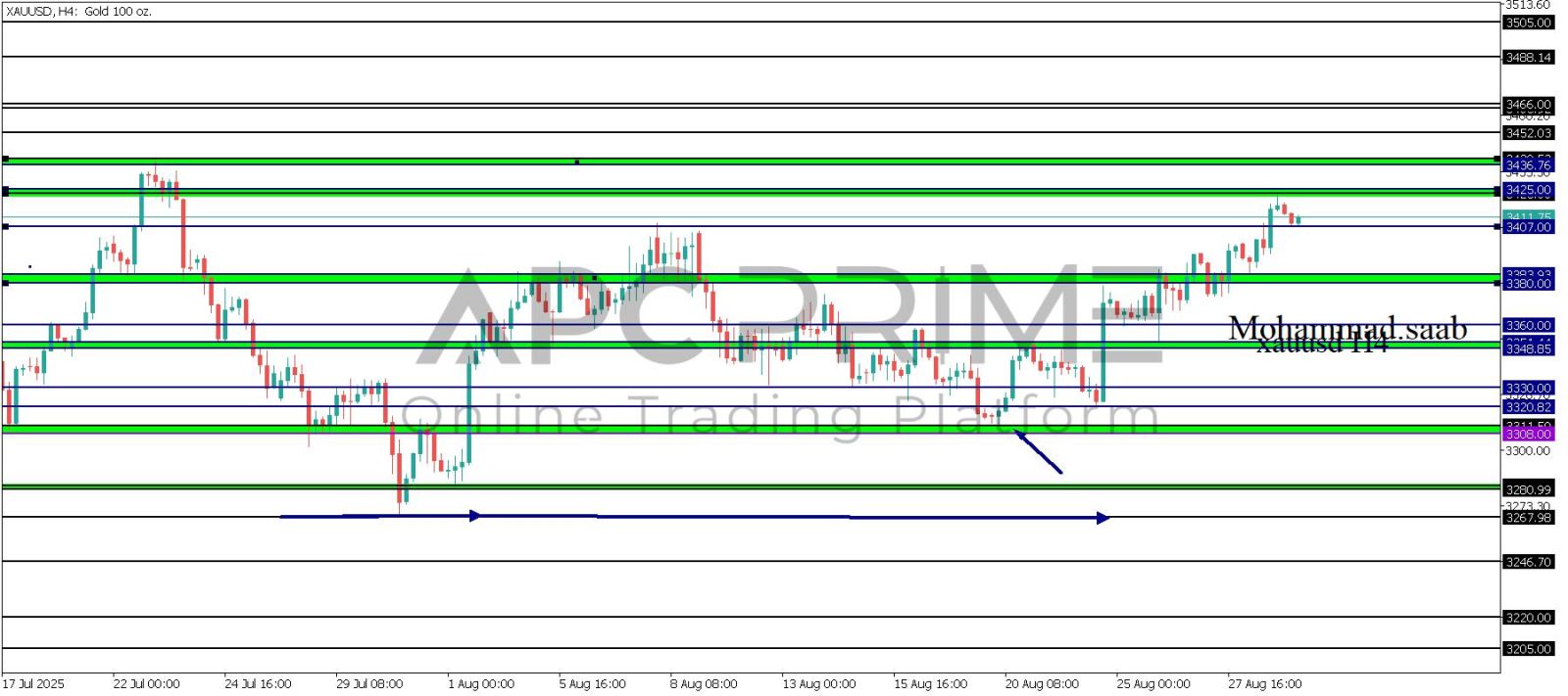 المنطقة الأهم (3407) احتمالية الارتداد منها ممكنة ولكن بكسرها وإغلاق أسفل بشمعة أربع ساعات يتجه السعر إلى منطقة الدعم (3380-3383) احتمالية الارتداد منها ممكنة ولكن بكسرها وإغلاق أسفل بشمعة أربع ساعات يتجه السعر إلى منطقة الدعم (3360)