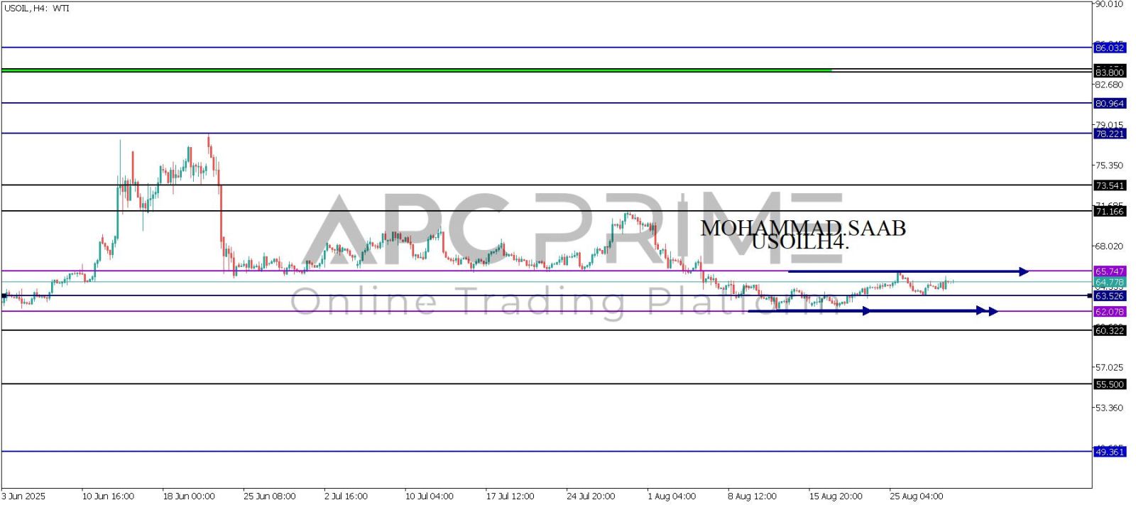 المنطقة الأهم (63.526) ثبات السعر أعلى المنطقة الأهم يتجه السعر إلى منطقة المقاومة (65.747) احتمالية الارتداد منها ممكنة ولكن باختراقها وإغلاق أعلى بشمعة أربع ساعات يتجه السعر إلى منطقة المقاومة (71.166)