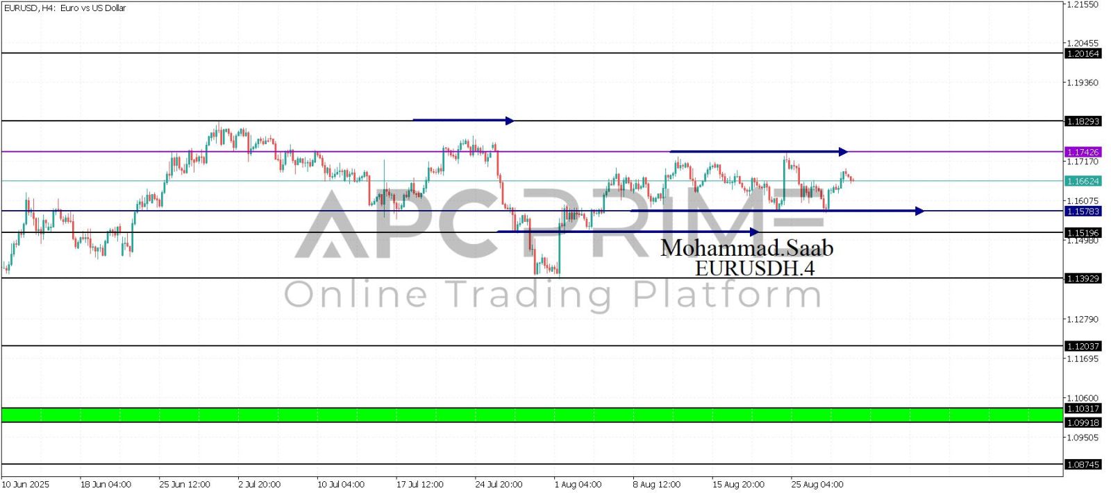 المنطقة الأهم (1.15783) ثبات السعر أعلى المنطقة الأهم يتجه السعر إلى منطقة المقاومة (1.17426) احتمالية الارتداد منها ممكنة ولكن باختراقها وإغلاق أعلى بشمعة أربع ساعات يتجه السعر إلى منطقة المقاومة (1.18293)