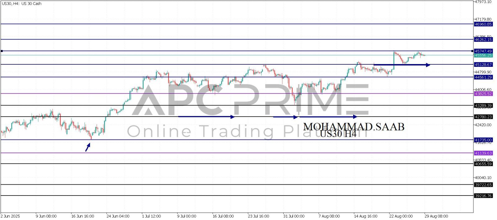 المنطقة الأهم (45128) احتمالية الارتداد منها ممكنة ولكن بكسرها وإغلاق أسفل بشمعة أربع ساعات يتجه السعر إلى منطقة الدعم (44561) احتمالية الارتداد منها ممكنة ولكن بكسرها وإغلاق أسفل بشمعة أربع ساعات يتجه السعر إلى منطقة الدعم (43825)