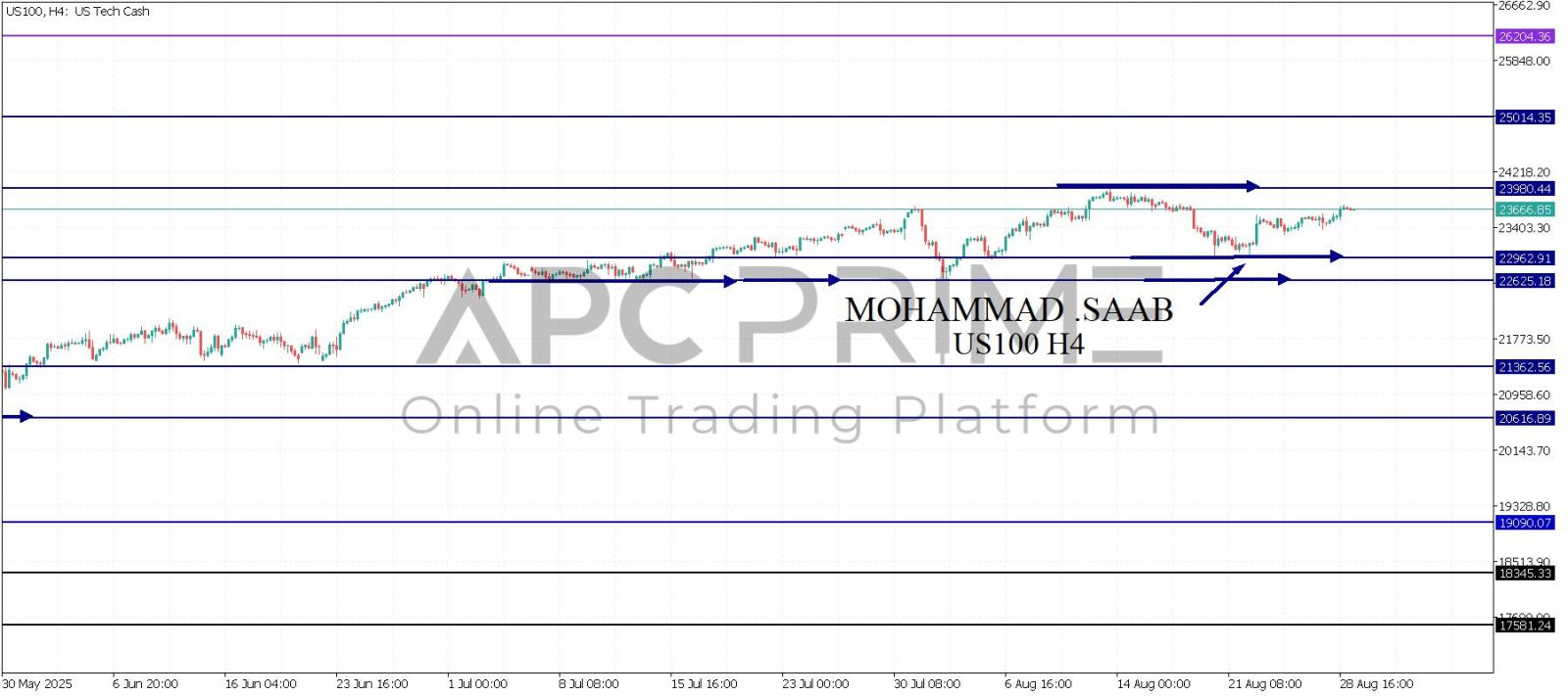 المنطقة الأهم (22962) ثبات السعر أعلى المنطقة الأهم يتجه السعر إلى منطقة المقاومة (23980) احتمالية الارتداد منها ممكنة ولكن باختراقها وإغلاق أعلى بشمعة أربع ساعات يتجه السعر إلى منطقة المقاومة (25014)
