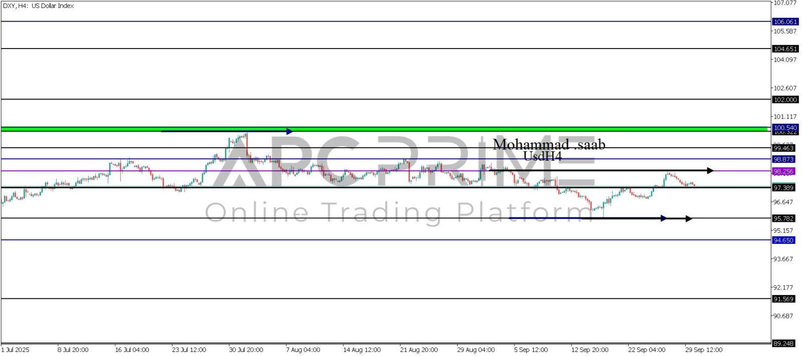 المنطقة الأهم (98.256) ثبات السعر أسفل المنطقة الأهم يتجه السعر إلى منطقة الدعم (97.389) احتمالية الارتداد منها ممكنة ولكن بكسرها وإغلاق أسفل بشمعة أربع ساعات يتجه السعر إلى منطقة الدعم (95.782)