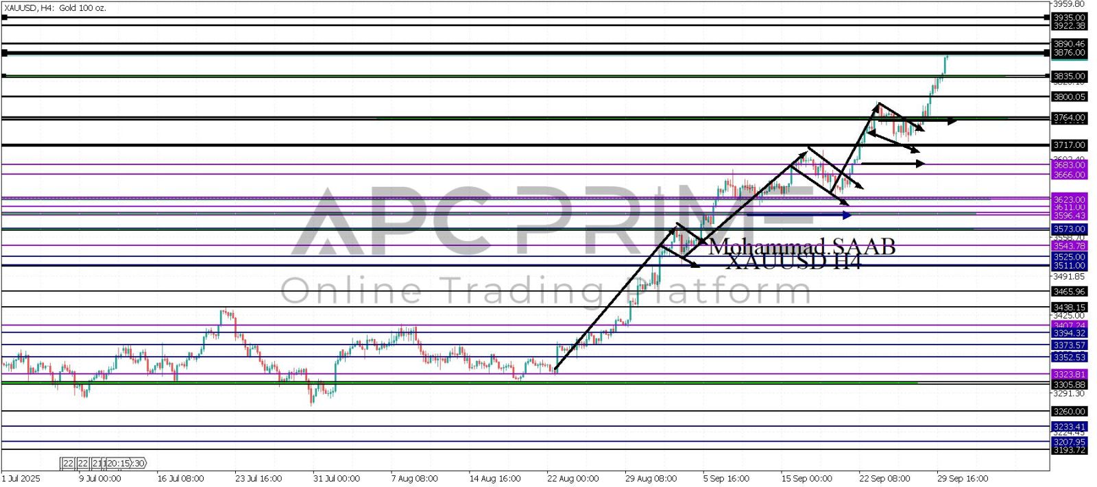 المنطقة الأهم (3835-3832) ثبات السعر أعلى المنطقة الأهم يتجه السعر إلى منطقة المقاومة (3876-3873) احتمالية الارتداد منها ممكنة ولكن باختراقها وإغلاق أعلى بشمعة أربع ساعات يتجه السعر إلى منطقة المقاومة (3890)