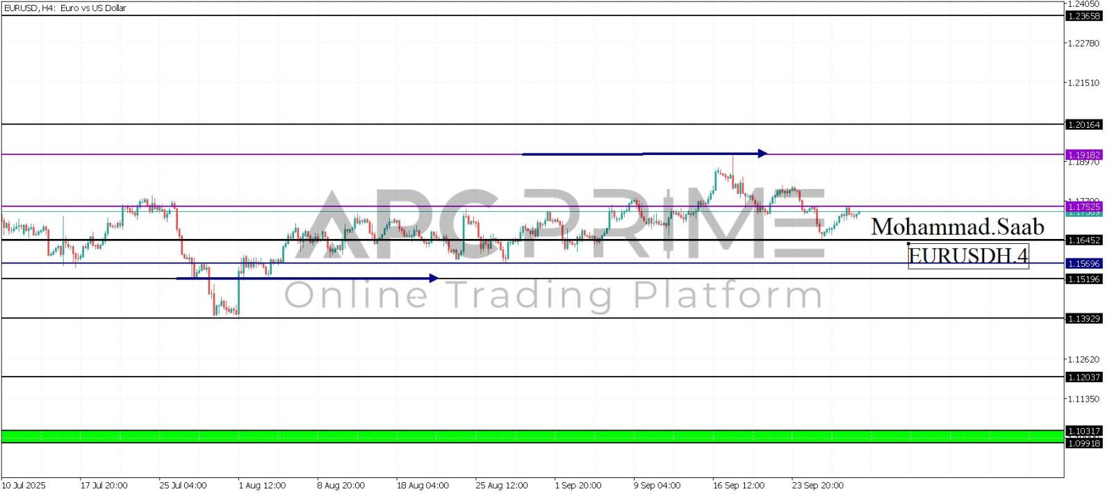 المنطقة الأهم (1.16425) ثبات السعر أعلى المنطقة الأهم يتجه السعر إلى منطقة المقاومة (1.17525) احتمالية الارتداد منها ممكنة ولكن باختراقها وإغلاق أعلى بشمعة أربع ساعات يتجه السعر إلى منطقة المقاومة (1.19182)