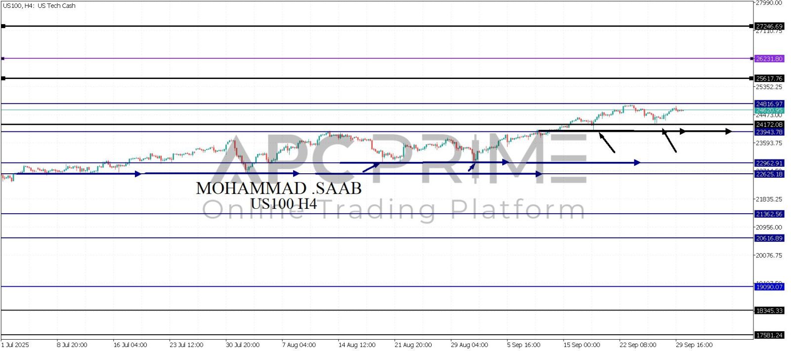 المنطقة الأهم (24172) ثبات السعر أعلى المنطقة الأهم يتجه السعر إلى منطقة المقاومة (24816) احتمالية الارتداد منها ممكنة ولكن باختراقها وإغلاق أعلى بشمعة أربع ساعات يتجه السعر إلى منطقة المقاومة (25617)