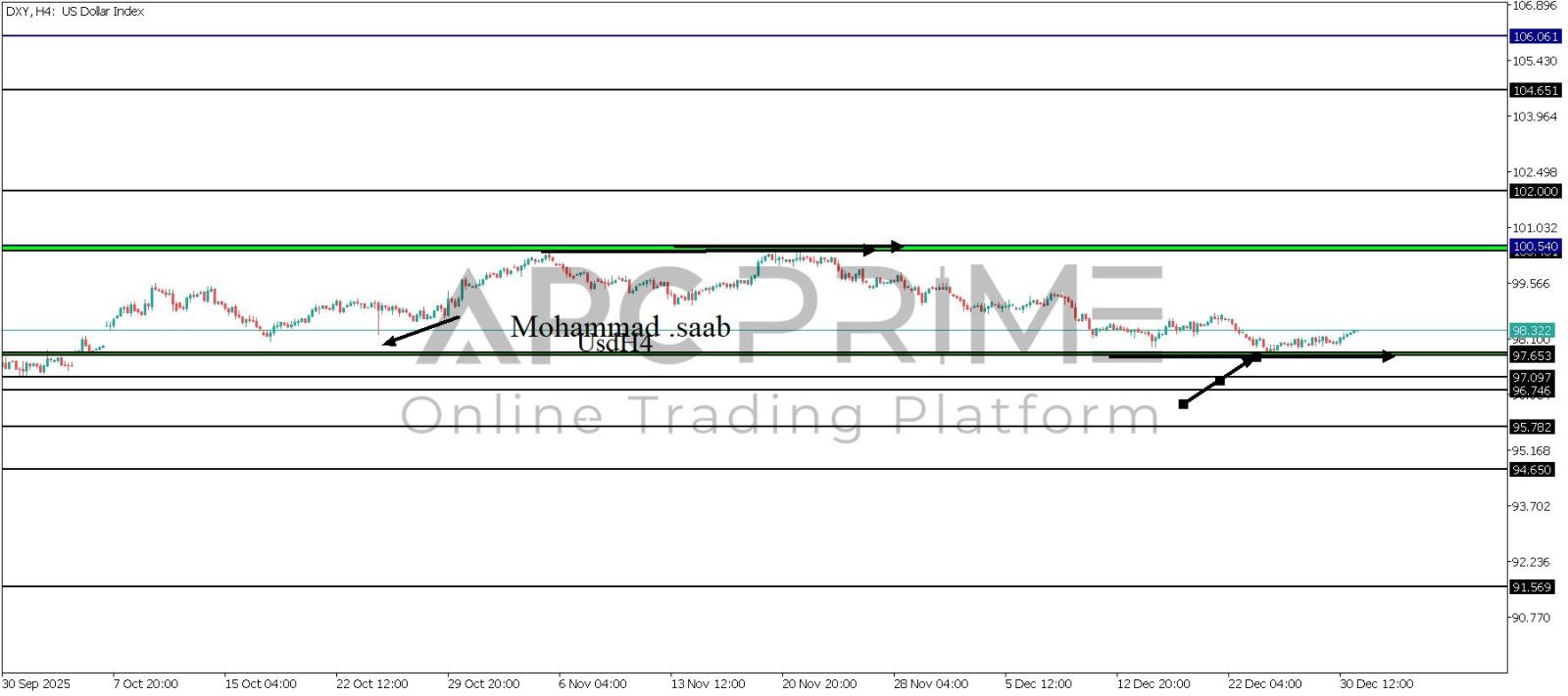 المنطقة الأهم (97.653-97.656) ثبات السعر أعلى المنطقة الأهم يتجه السعر إلى منطقة المقاومة (100.540-100.401) احتمالية الارتداد منها ممكنة ولكن باختراقها وإغلاق أعلى بشمعة أربع ساعات يتجه السعر إلى منطقة المقاومة (102.000)